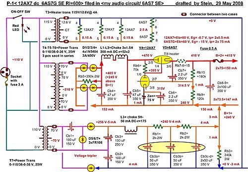 雙電源供應 : 電源變壓器用Made in Taiwan多只串接。 以AC-70V三倍整流取的 B+1=240V。 以AC-3*70V=210V整流,再12AX7 + 6AS7G調壓取得B+2=170+240=410V。