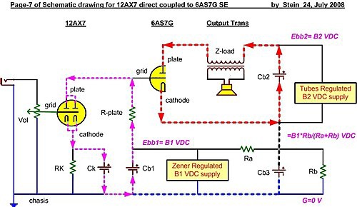 這兩個迴路在12AX7-plate跟6AS7G-grid<相碰掛鉤>,另一頭在Ra-Rb-Cb3<交會>,因此訊號迴路是透過Cb3<交連>的。