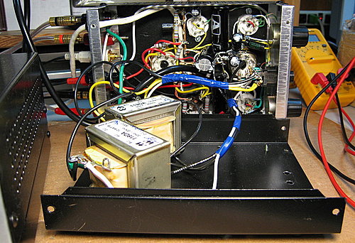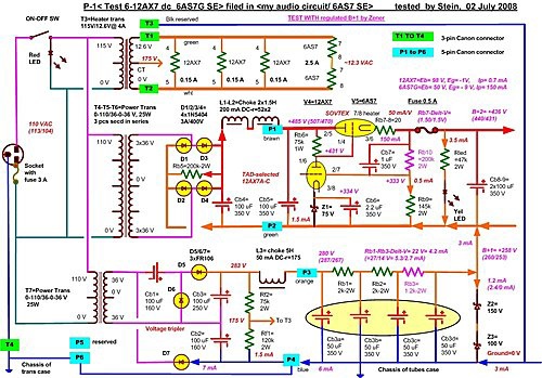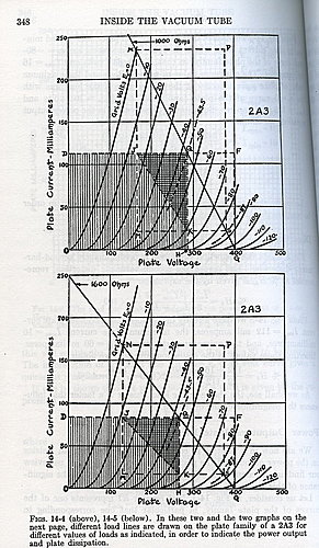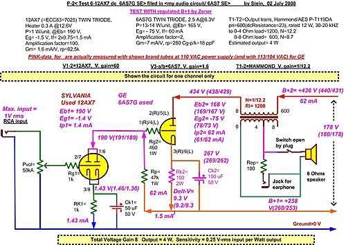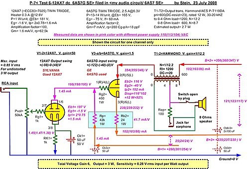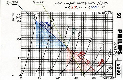 這裡B2=Ebb設在120 VDC。由於Ra有25 V的壓降,偏壓工作在以-40 V為中心工作點,靠著volume的調音量,變化 正向可以到 0V, 負向可以到-120 V,沒有柵極電流(class-1),沒有截止電流(class-A),滿足Class-A1的條件,輸出也線性化。推算輸出功率約3W。
