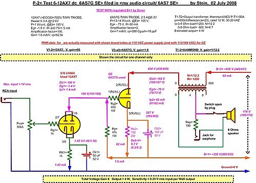 當RCA輸入訊號經過Vol音量衰減到擺幅 正/負1.5 V時, plate輸出負向擺幅約 -100 V不到 (由工作點 200 V降低到50V, 因為電流變化(1.45-3.8)mA乘上42kR=-98 V),正向擺幅約 50 V不到(由工作點 200V增加到 248V, 因為電流變化(1.45-0.3)mA乘上42kR=48 v)。電壓放大倍數平均大約是50。
