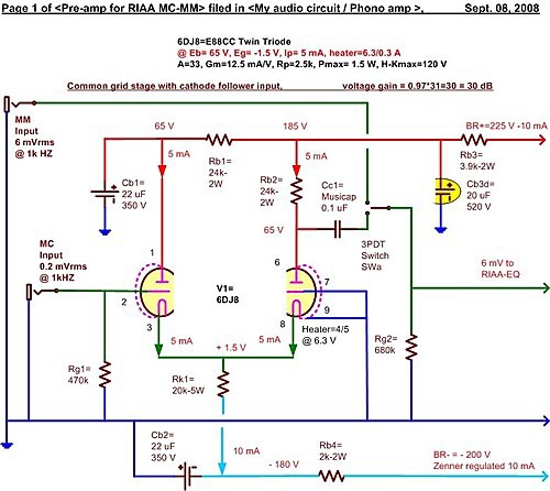 下圖 page 1 of pre-amp for RIAA MC-MM 線路解說:
