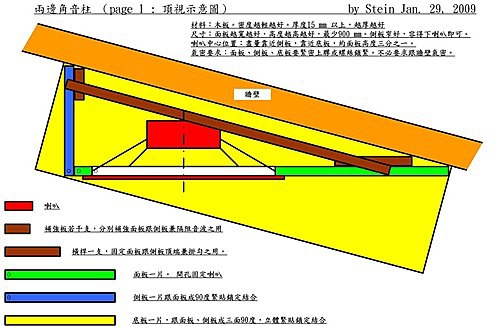 Jensen 12” driver裝上紙板、紙箱,只會發出刺耳之聲,聽不到有力的重低音,也沒有柔和的中音,出乎意料。只好乖乖的花一番功夫,打造一對1米2高的音箱。這是背後負載方式,隔成前後氣腔,裡面塞些細木條刨下來的絨球團,就像下面的示意圖。