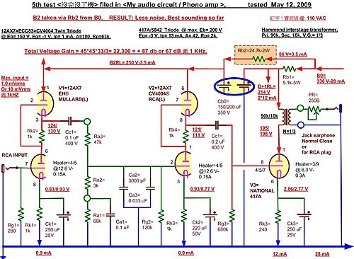 1. Interstage transformer 90k/10Kn=1/3換上正典的2500/8N=1/18. 聲音沒有不對。耳機音量可以調節大小,但最大量也不是很大聲。輸出到417A-71A-SE音量由原來6轉-8要加大到轉11-12. 放大倍數不夠。把這2500/8opt拆下來,踢出機殼,恢復90k/10k.