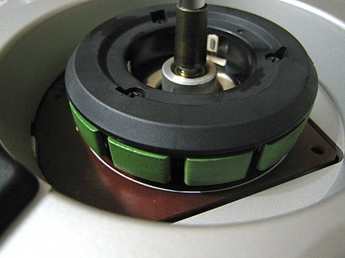 這唱盤盤面靠著4個支撐的彈簧,坐落在長方形的塑膠"臉盆"底座上。