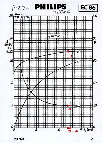 工作在 Plate volts屏壓175 V, Grid volts柵極偏壓 -1.5 V時,她的plate resistance屏阻Rp是 5 K ,Amplification factor放大因數 u 是 68,如紅色圈註。