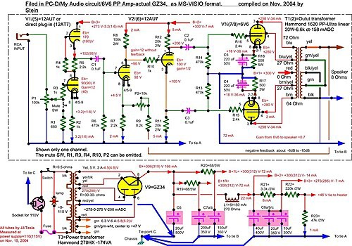 採用最便宜的3極/5極管子6BM8出力管。4支6BM8,加上2支12AU7信號/驅動管,1支GZ34整流管,用10吋乘6吋的機箱可以擺得下。Power and Output transformer採用Hammond Canada 製造的現成品。