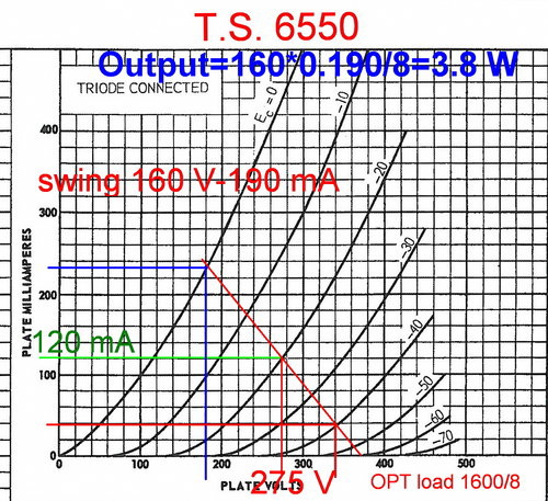 如果接上 手上有的 Output transformer 負載 1600//16-8-4,可以畫出3條負載線