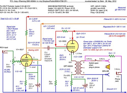 3. 要我來的話,會把 91k 從 EL34 拆離,並上 電容 (1-10 uF) 改接到共地,取消負迴授。讓 上半6SN7 柵極確實的架在 75 V, 平均一點 上、下6SN7的工作電壓。