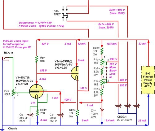 6SJ7管特性變化大,屏電壓 實際可能不好固定在 163V,因此連動 可變電阻 P1-a, P1-b 是必要的。