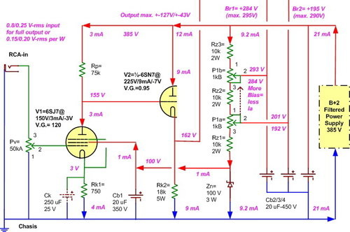 底下的Heaters串接 120V 可以不用變壓器,上面的B電200 V 每聲道就用4只。