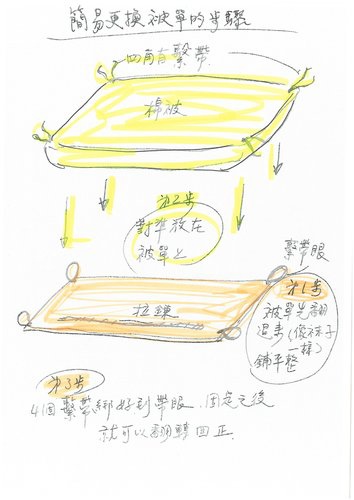 老妻說她買被單時看店員小姐一個人,輕輕鬆鬆的更換,但是看了幾次,還不知道要訣在那裡,跟老妻 兩個人東拉西扯,弄得滿頭大汗。