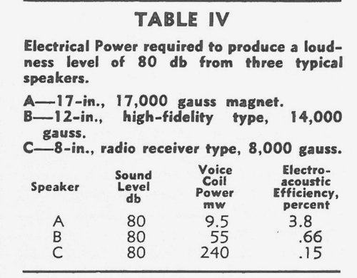 表 IV 說 3 種 典型的喇叭 產生 80 db 需要的 喇叭線圈電功率,及換算出的 電氣─音響 效率。